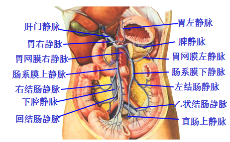 肝门静脉为一粗短的静脉干,由肠系膜上静脉和脾静脉在胰颈后方汇合而成,其起于毛细血管,终止于毛细血管(肝血窦),无静脉瓣,收集除肝以外腹腔内所有不成对脏器的静脉血。肝门静脉的主要属支有脾静脉、肠系膜上静脉、肠系膜下静脉、胃左静脉、胃右静脉、胆囊静脉和附脐静脉7条。肝门静脉与上、下腔静脉间存在侧支吻合,当肝门静脉循环受阻时(如肝硬化等),则可通过食管静脉丛、直肠静脉丛、脐周静脉网及其他途径建立侧支循环,保证血液的正常向心流动。