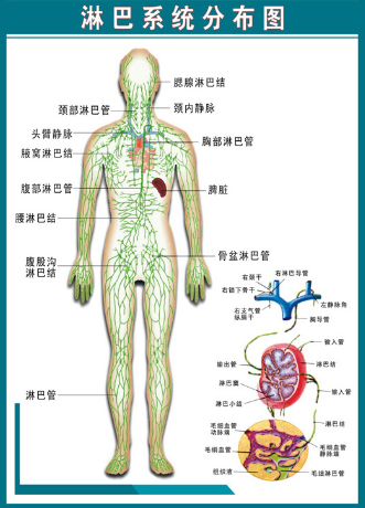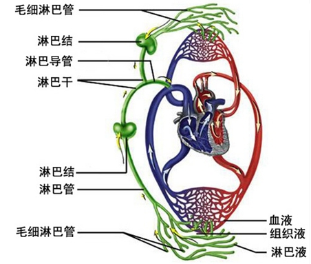 淋巴系统由淋巴管道、淋巴器官和淋巴组织构成。机体的部分组织液进入毛细淋巴管形成淋巴,经各级淋巴管最终注入静脉,成为静脉的辅助系统,但与静脉不同的是其在向心流动过程中要经过多个淋巴结的过滤。淋巴器官可产生淋巴细胞及抗体等,是人体重要的防御装置。淋巴组织存在于消化、呼吸、泌尿和生殖管道内,分弥散淋巴组织和淋巴小结,起防御屏障作用。