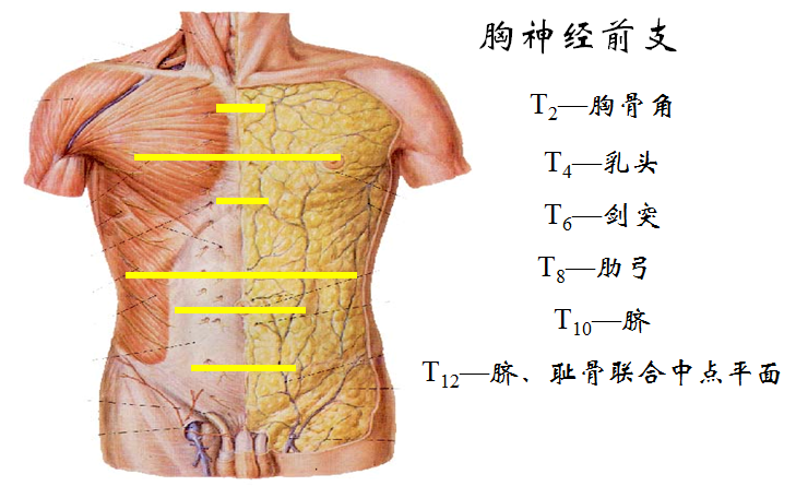 胸神经前支呈节段性分布,胸骨角、乳头、剑突、肋弓最低点、脐、脐耻中点等分别由第2、4、6、8、10、12胸神经前支的前皮支分布。脊神经前支的分布平面,对临床麻醉及脊髓、脊神经损伤的定位诊断具有重要意义。