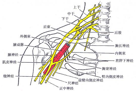 臂丛由第5~8颈神经前支构成,自臂丛上发出5大分支(正中神经、尺神经、桡神经、肌皮神经和腋神经)外,尚有胸背神经、胸长神经等分支分布于上肢和胸壁肌。