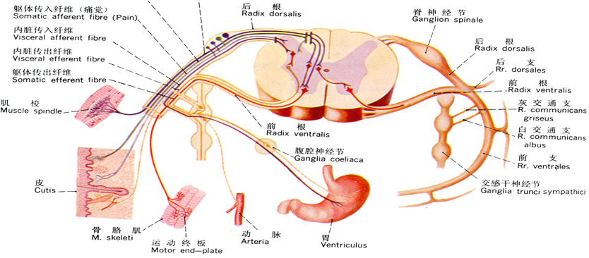 脊神经连于脊髓,共31对,即颈8、胸12、腰5、骶5、尾1。每根脊神经均由前根和后根合成,前根属运动性质,其纤维发自脊髓的前角和中间带,含躯体运动和内脏运动2种纤维成分;后根属感觉性质,由脊神经节内细胞的周围突构成,脊神经节周围突参与形成脊神经,而中枢突连于脊髓,含躯体感觉和内脏感觉2种纤维成分,因此,脊神经属混合性质,均含有4种纤维成分,脊神经损伤后同时出现感觉障碍和运动障碍。