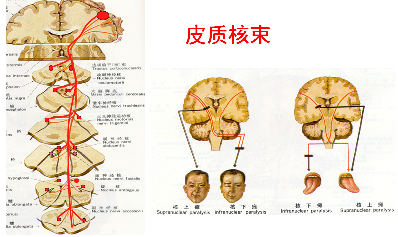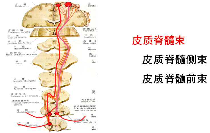 下行纤维束主要是锥体束的皮质脊髓束(支配躯干四肢骨骼肌运动)和皮质核束(支配头颈骨骼肌运动)。