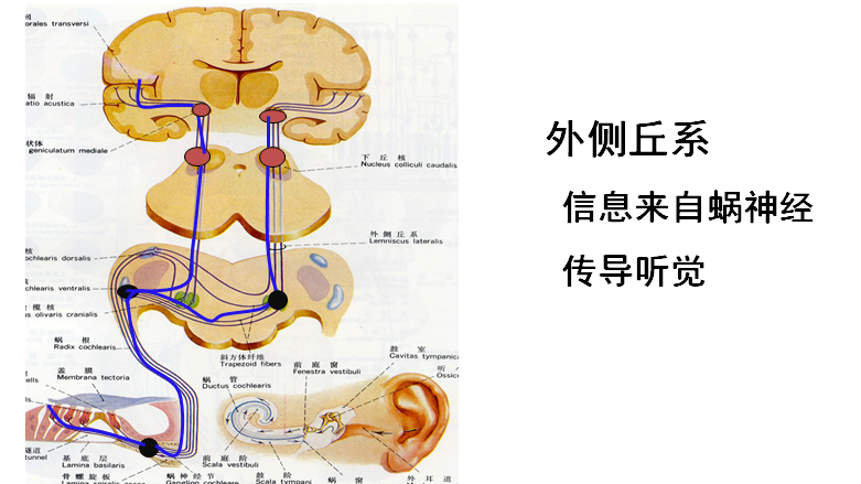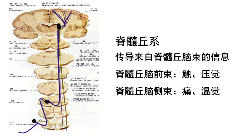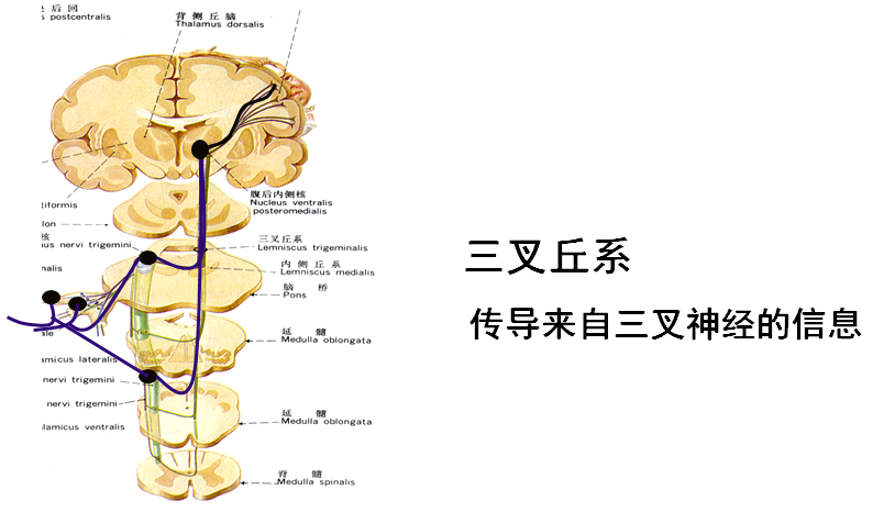 脑干白质主要由长的上行纤维束、下行纤维束和出入小脑的纤维构成,长的上行纤维束主要有内侧丘系(传导躯干四肢深感觉)、脊髓丘系(传导躯干四肢浅感觉)、外侧丘系(传导听觉)、三叉丘系(传导头面部浅感觉)和内侧纵束的上行纤维。