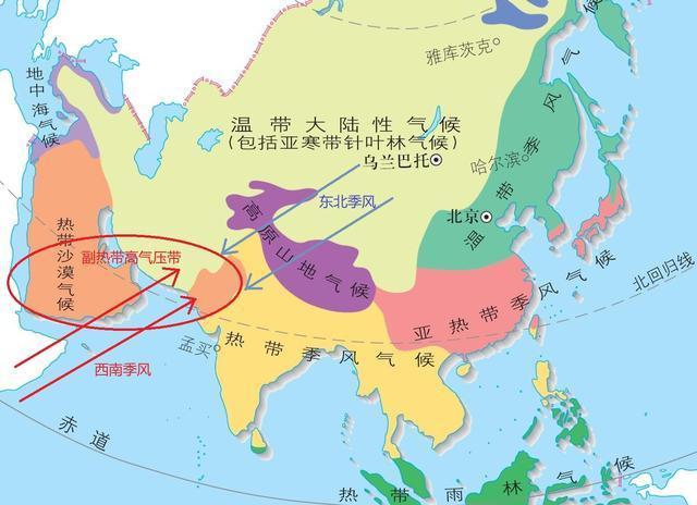 很明显,我们发现巴基斯坦地区的热带沙漠气候夹在西侧的温带大陆性气候和东侧的热带季风气候之间,十分特别。热带沙漠气候多分布在大陆的中西部,而大陆的东部地区由于海陆热力性质差异的差异,通常会把副热带高气压带切断,比如在亚欧大陆的东部地区,也就是南亚、东南亚和东亚地区多分布的是季风气候,也就是南亚地区多分布有热带季风气候。