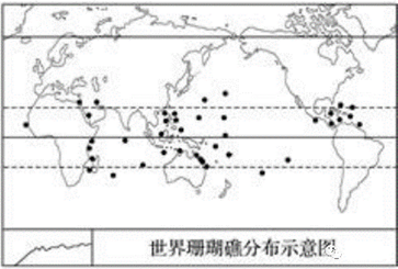 材料二 世界珊瑚礁分布示意图。