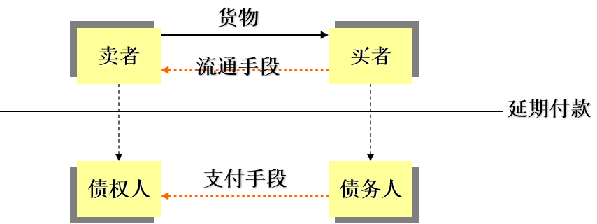 货币作为交换的媒介执行流通手段的职能,将统一的过程分解为两个:出卖的过程和购买的过程。可能产生买和卖的脱节——经济危机的可能性。