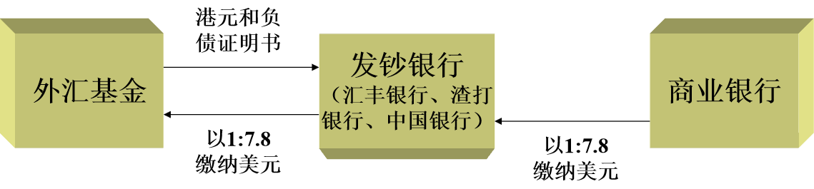 商业银行与发钞银行的套利活动:港元贬值→港元退回外汇基金→美元流通量增加→美元汇率下降→汇率恢复至联系汇率水平