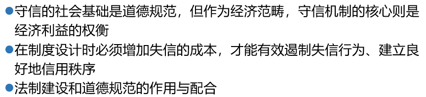 在信用制度的设计时,除了需要倡导诚实守信的道德风尚,还需要建立并完善违约和欺诈信息的公示系统,建立诚信黑名单制度,并通过法律和各种合理手段对恶意失信和欺诈行为进行严惩,需要通过大幅增加失信的成本,来有效遏制失信行为,逐步建立良好的信用秩序。