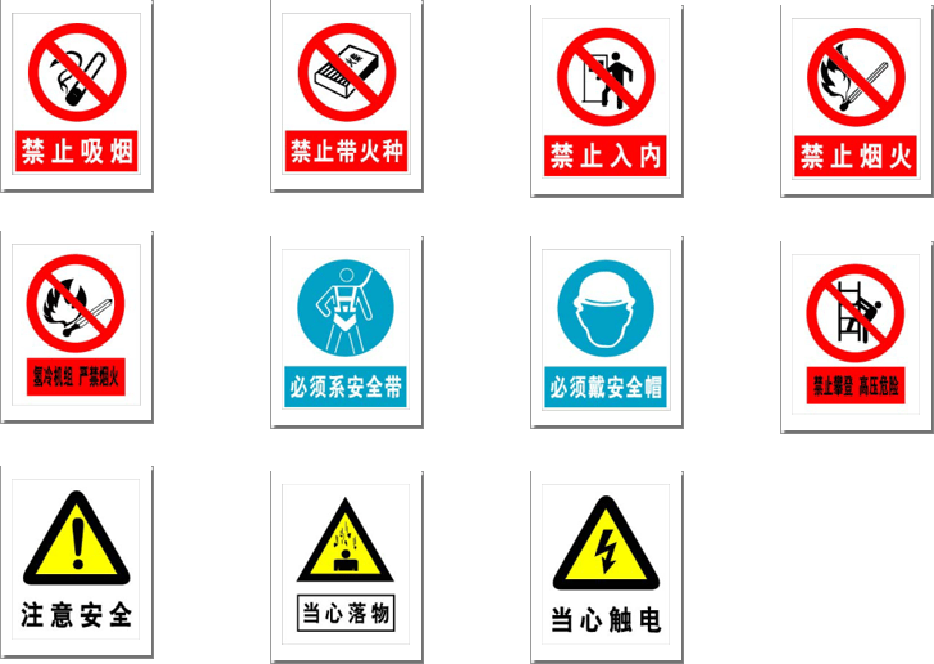 我国规定的禁止标志共有30个,其中与电力相关的,如:注意安全、当心触电、当心爆炸、当心火灾、当心腐蚀、当心中毒、当心机械伤人、当心伤手、当心吊物、当心扎脚、当心落物、当心坠落、当心车辆、当心弧光、当心冒顶、当心瓦斯、当心塌方、当心坑洞、当心电离辐射、当心裂变物质、当心激光、当心微波、当心滑跌、等。