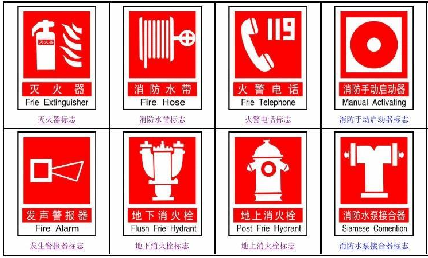 消防设备提示标志(红色背景)有七个:消防警铃、火警电话、地下消火栓、地上消火栓、消防水带、灭火器、消防水泵结合器。