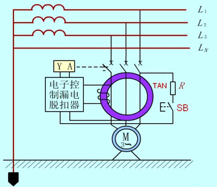 设备发生漏电或后方有人触电时,出现额外的零序电流,互感器副边产生感应电动势,电磁铁动作,并通过开关QF断开电源。