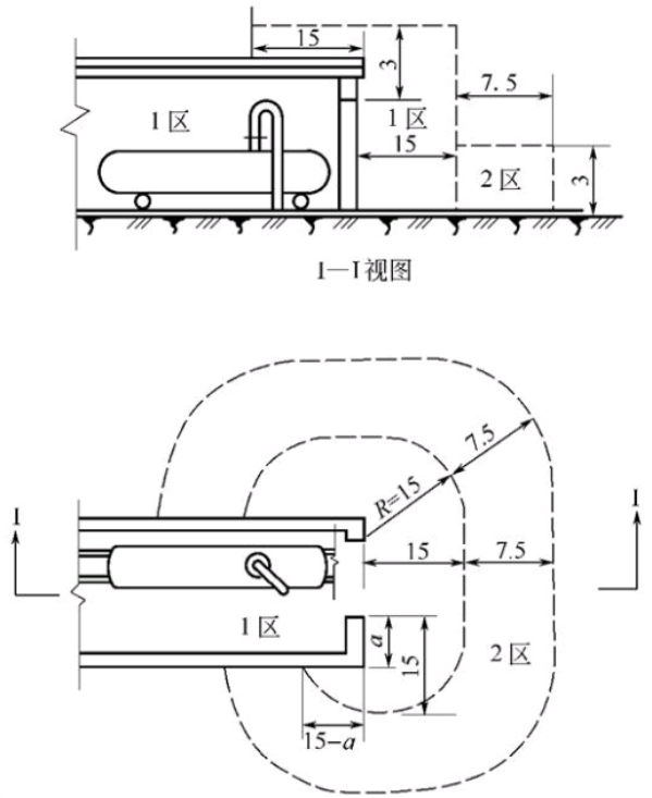 以释放源为中心,半径为15m,地坪上高度为7.5m,顶部与释放源的距离为7.5m的范围划分为2区。