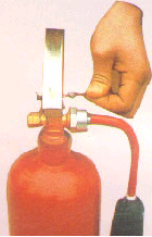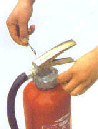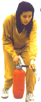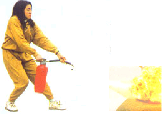 (5)在距离火焰2米的地方,右手用力压下压把,左手拿着喷嘴管左右摇摆,喷射干粉覆盖燃烧区,直至把火全部扑灭.