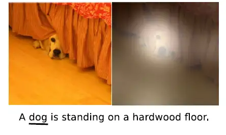 首先来从直觉上理解这个注意力,它的作用就是模型在每个时间步生成单词的时候,模型会关注这个单词所对应的图像区域。比如下图 “狗” 的照片,模型在生成 “dog” 这个单词时,模型会着重关注图像中 “狗” 的区域,所以说下图中 “狗” 的区域要比其他地方要来的明显点。