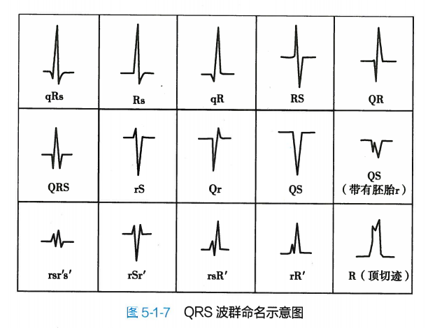 QRS波群可因检测电极的位置不同而呈多种形态,已统一命名如下:首先出现的位于参考水平线以上的正向波称为R波;R波之前的负向波称为Q波;S波是R波之后第一个负向波;R'波是继S波之后的正向波;R'波后再出现负向波称为S'波;如果QRS波只有负向波,则称为QS波。至于采用Q或q、R或r、S或s表示,应根据其幅度大小而定,般而言,若各波振幅<0.5mV,则用小写英文字母qr、s表示;若振幅≥0.5mV,则用大写英文字母Q、R、S表示。图5-1-7为QRS波群命名示意图。