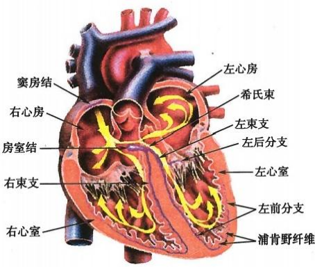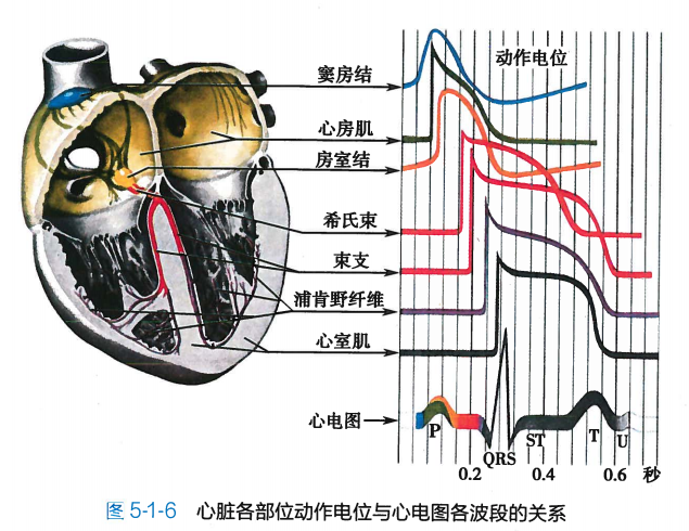 心脏的特殊传导系统由窦房结、结间束(分为前、中、后结间束)、房间束(起自前结间束,称Bachmann束)、房室交界区(房室结、希氏束)、束支(分为左、右束支,左束支又分为前分支和后分支)以及浦肯野纤维(Pukinje fiber)构成。心脏的传导系统与每一心动周期顺序出现的心电变化密切相关(图5-1-5)。