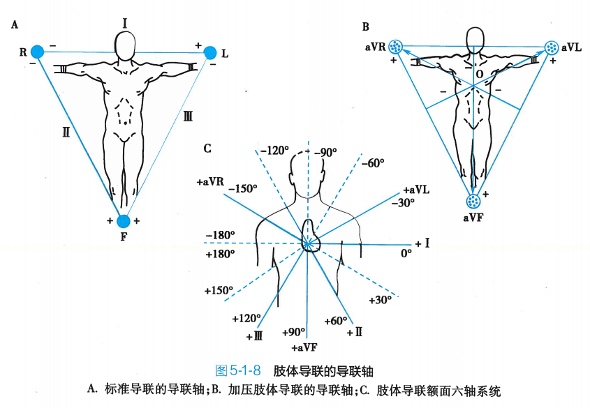 在每一个标准导联正负极间均可画出一假想的直线,称为导联轴。为便于表明6个导联轴之间的方向关系,将Ⅰ、Ⅱ、Ⅲ导联的导联轴平行移动,使之与aVR、aVL、aVF的导联轴一并 通过坐标图的轴中心点,便构成额面六轴系统(hexaxial system)(图5-1-8C)。 此坐标系统采用±180°的角度标志。以左侧为0°,顺钟向的角度为正,逆钟向者为负。每个导联轴从中心点被分为正负两半,每个相邻导联间的夹角为30°。此对测定心脏额面心电轴颇有帮助。肢体各导联的电极位置和正负极连接方式见图。