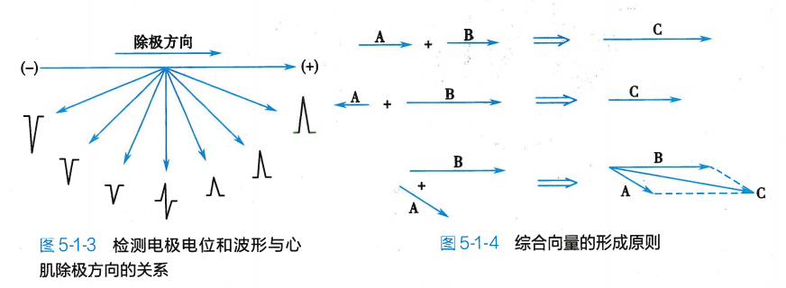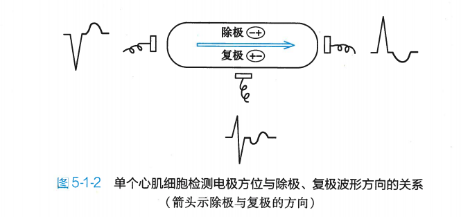 就单个细胞而言,在除极时,检测电极对向电源(即面对除极方向)产生向上的波形,背向电源(即背离除极方向)产生向下的波形,在细胞中部则记录出双向波形。复极过程与除极过程方向相同,但因复极化过程的电偶是电穴在前,电源在后,因此记录的复极波方向与除极波相反(图5-1-2)。