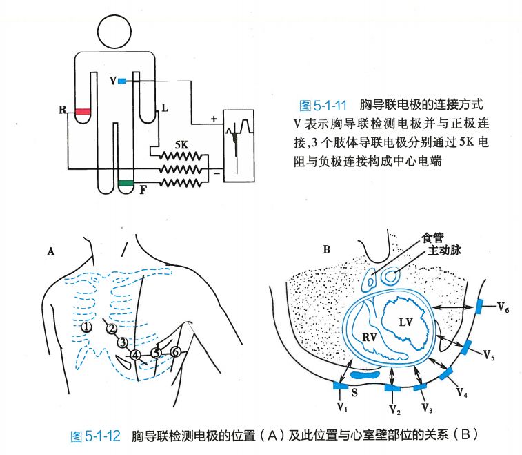 2.胸导联(chest leads) 包括V₁~V₆导联。检测之正电极应安放于胸壁规定的部位,另将肢体导联3个电极分别通过5K电阻与负极连接构成中心电端(central terminal)(图5-1-11)。胸导联检测电极具体安放的位置为(图5-1-12):V₁位于胸骨右缘第4肋间;V₂位于胸骨左缘第4肋间;V₃位于V₂与V₄两点连线的中点,V₄位于左锁骨中线与第5肋间相交处;V5位于左腋前线与V₄同一水平处;V₆位于左腋中线与V₄同一水平处。