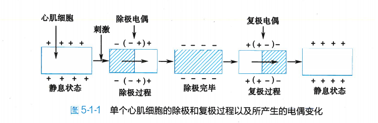 心肌细胞在静息状态时,膜外排列阳离子带正电荷,膜内排列同等比例的阴离子带负电荷,保持平衡的极化状态,不产生电位变化。当细胞一端的细胞膜受到刺激(阈刺激),其通透性发生改变,使细胞内外正、负离子的分布发生逆转,受刺激部位的细胞膜出现除极化,使该处细胞膜外正电荷消失而其前面尚未除极的细胞膜外仍带正电荷,从而形成一对电偶(dipole)。电源(正电荷)在前,电穴(负电荷)在后,电流自电源流入电穴,并沿着一定的方向迅速扩展,直到整个心肌细胞除极完毕。此时心肌细胞膜内带正电荷,膜外带负电荷,称为除极(depolarization)状态。嗣后,由于细胞的代谢作用,使细胞膜又逐渐复原到极化状态,这种恢复过程称为复极(repolarization)过程,复极与除极先后程序一致,但复极化的电偶是电穴在前,电源在后,并较缓慢向前推进,直至整个细胞全部复极为止(图5-1-1)。