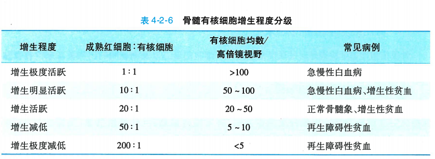 2. 估计骨髓有核细胞增生程度 在低倍视野(10×)下观察,骨髓中成熟红细胞与有核细胞的 大致比例判断骨髓增生程度;也可采用高倍视野(40×)下观察几个视野,得出平均每个高倍视野的 有核细胞数来判断。骨髓增生程度分五级,见表4-2-6。要观察多个、合适视野,并取其平均值。介于两者之间,增生程度往上提,因为骨髓穿刺抽吸的骨髓液有稀释的可能。