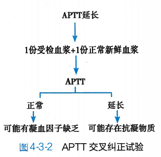本试验是用于鉴别是否凝血因子缺乏或有无抗凝物质存在。延长的 APTT,若能被1/2量的正常新鲜血浆所纠正,表示受检血浆中可能缺乏凝血因子;若不能纠正则表示受检血浆中可能存在抗凝物质(图4-3-2)。