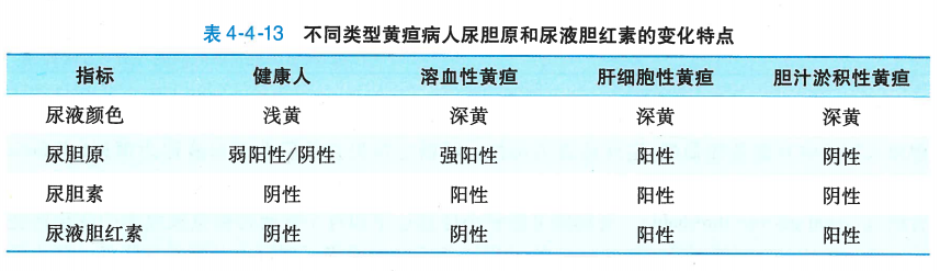 4. 尿液胆红素与尿胆原 尿液胆红素、尿胆原检查主要用于黄疸的鉴别,其变化特点见表4- 4-13。