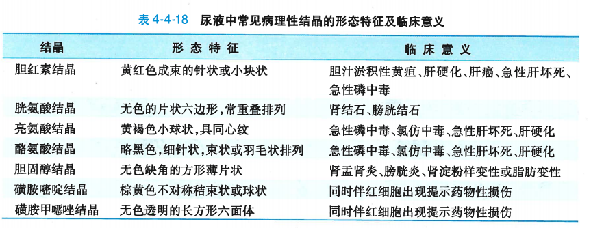 (2)病理性结晶:病理性结晶可由疾病因素或药物代谢异常所致,如胆红素结晶、胱氨酸结晶、亮氨酸结晶、酪氨酸结晶、胆固醇结晶和药物结晶等。尿液中常见病理性结晶的形态特征及临床意义见表4-4-18。