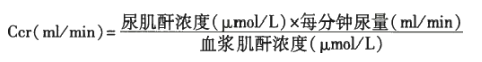 2.4小时留尿改良法 因留24小时尿不方便,易导致留不准(少)且高温时需冷藏,影响肌酐检测,因此常引起误差(偏低)。在严格控制条件下,24小时内血浆和尿液肌酐含量较恒定,为临床应用方便,故可用4小时尿及空腹一次性取血进行肌酐测定,先计算每分钟尿量(ml/min), 再按公式1.(4)计算清除率。