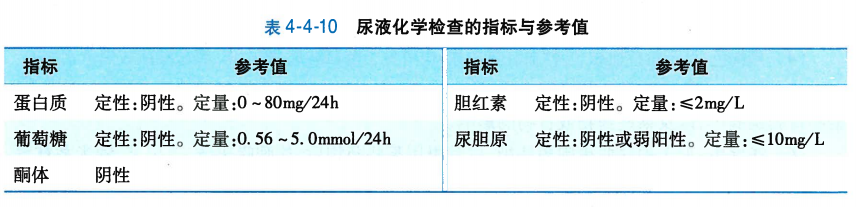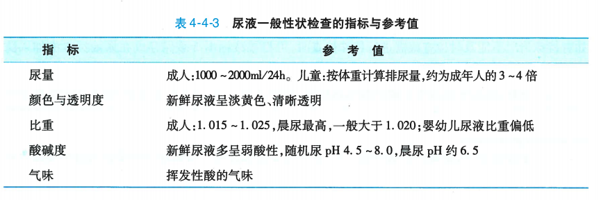 尿液一般性状检查的指标与参考值见表4-4-3。