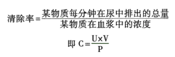 C为清除率(ml/min),U为尿中某物质的浓度,V为每分钟尿量(ml/min),P为血浆中某物质的浓度。