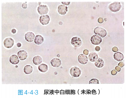 (2)白细胞和脓细胞:尿液中的白细胞主 要是中性粒细胞(图4-4-3),在新鲜尿液中其 形态与血液白细胞一致;在炎症过程中被破坏或死亡的白细胞称为脓细胞(pus cell)。在低渗尿液中,中性粒细胞吸水肿胀,胞质内的颗粒呈布朗分子运动,由于光的折射,在油镜下可见灰蓝色发光现象,称为闪光细胞(glitter cell),多见于肾盂肾炎。