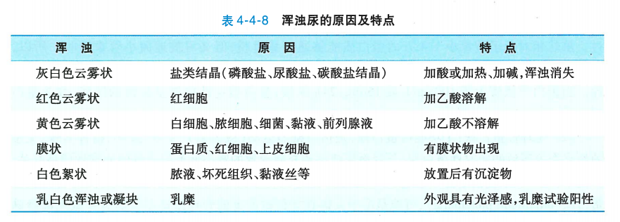 3. 透明度 正常尿液清晰透明。新鲜尿液发生浑浊可由盐类结晶、红细胞、白细胞(脓细胞)、 细菌、乳糜等引起。浑浊尿产生的原因及特点见表4-4-8。