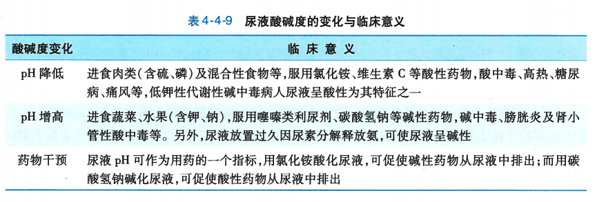 5. 酸碱度(pH) 尿液酸碱度受食物、药物和多种疾病的影响。尿液酸碱度的变化与临床意义见表4-4-9。