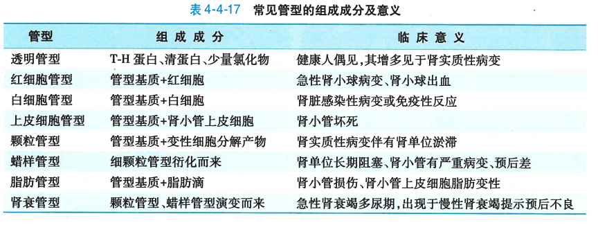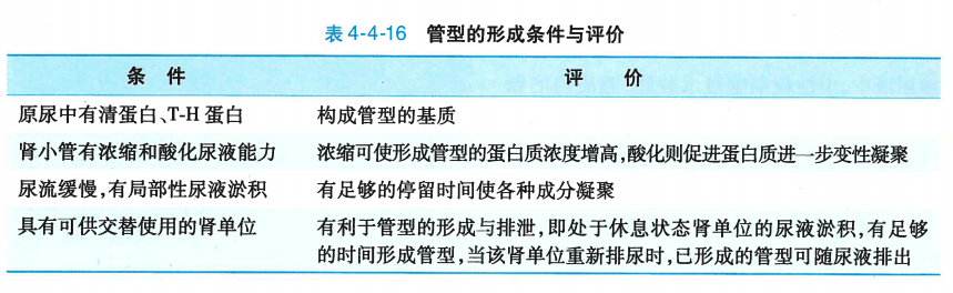 2. 管型 管型(cast)是蛋白质、细胞及其崩解产物在肾小管、集合管内凝固而成的圆柱形蛋白聚体,是尿沉渣中最有诊断价值的成分。构成管型的主要成分有由肾小管分泌的Tamm-Horsfall 蛋白(T-H蛋白)、血浆蛋白、各种细胞及其变性的产物等。管型的形成条件与评价见表4-4-16。