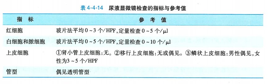 尿液显微镜检查的指标与参考值见表4-4-14。