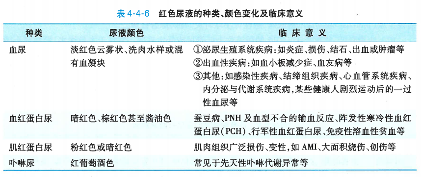 (1)红色:最常见的尿液颜色变化是红色(表4-4-6),其中以血尿最常见。含有一定量红细胞的尿液称为血尿(hematuria) 。1000ml 尿液所含血量超过1ml,外观可出现红色的尿液称为肉眼血尿(macroscopic hematuria)。