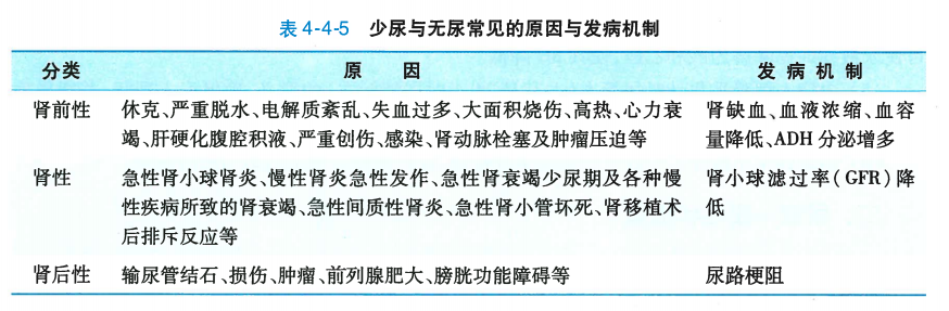 (2)少尿与无尿:成人24小时尿量少于400ml或每小时少于17ml,学龄前儿童尿量少于 300ml/24h,婴幼儿尿量少于200ml/24h,称为少尿(oliguria) 。成人24小时尿量少于100ml,小儿少于30~50ml,称为无尿(anuria) 。少尿与无尿主要由肾前性、肾性和肾后性等因素所致(表4-4-5)。