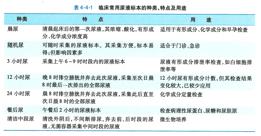 1. 尿液标本采集方法 尿液标本采集和处理是否正确可直接影响检测结果的准确性。根据检测目的不同,尿液标本可分为晨尿、随机尿、计时尿和特殊尿等。临床常用尿液标本的种类、特点及用途见表4-4-1。