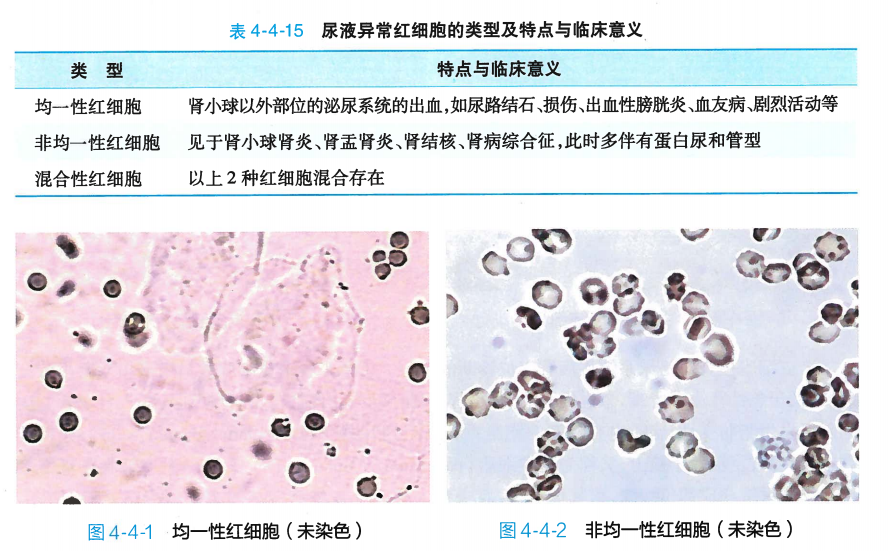 根据尿液红细胞的形态可将红细胞分为3种,其特点与临床意义见表4-4-15。尿液中红细胞见图4-4-1、图4-4-2。