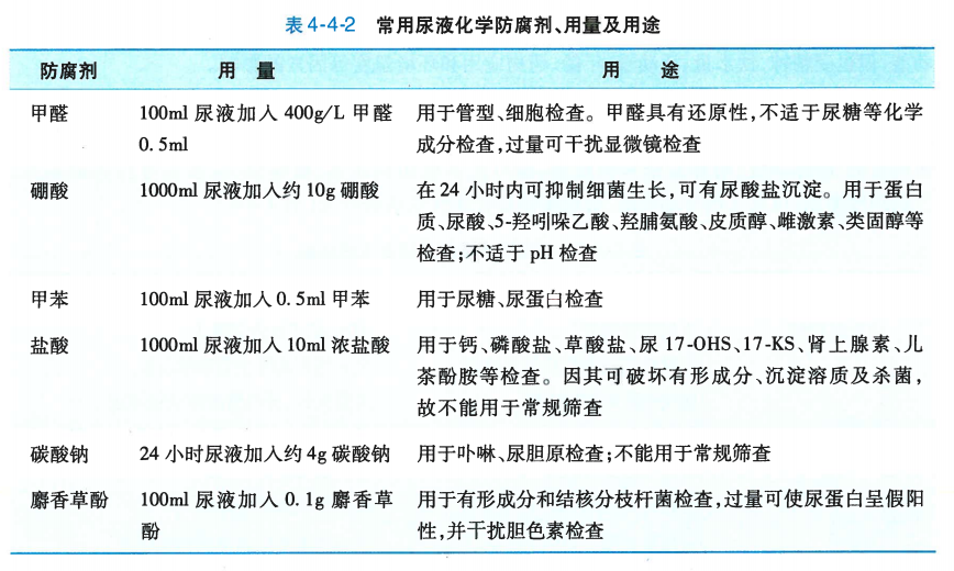 (2)化学防腐:防腐剂可抑制细菌生长,维持尿液的弱酸性。可根据不同的检查目的选择适宜 的防腐剂。当有多种防腐剂适用于尿液保存时,应选择危害性最小的防腐剂。常用尿液化学防腐剂、用量及用途见表4-4-2。