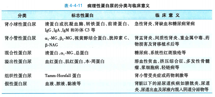 (2)病理性蛋白尿:见于各种肾脏及肾脏以外疾病所致的蛋白尿,多为持续性蛋白尿(表4-4-11)。
