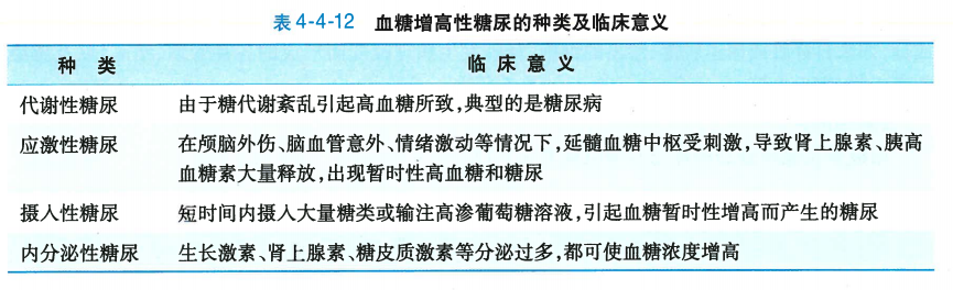 (1)血糖增高性糖尿:血糖增高性糖尿的种类及临床意义见表4-4-12。