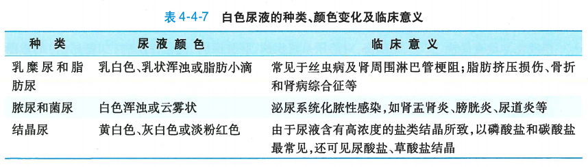 (3)白色:白色尿液的种类、颜色变化及临床意义见表4-4-7。