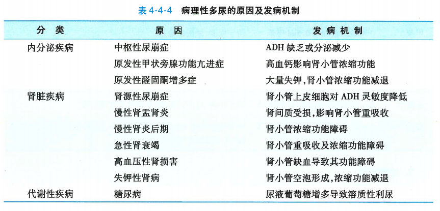 (1)多尿:成人24小时尿量大于2500ml, 儿童24小时尿量大于3000ml称为多尿(polyuria) 。 ①生理性多尿:当肾脏功能正常时,由于外源性或生理性因素所致的多尿,如饮水过多、食用含水量多的食物、静脉输液、精神紧张和癔症等,也可见于服用利尿剂、咖啡因、脱水剂等药物的病人。 ②病理性多尿:可见于内分泌疾病、肾脏疾病和代谢性疾病等病人(表4-4-4)。