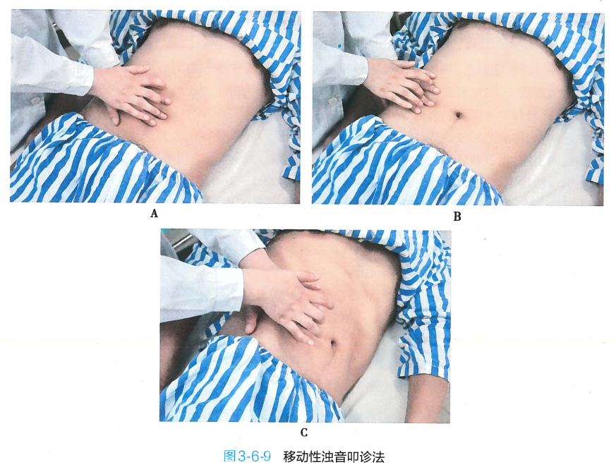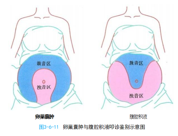 2. 巨大的卵巢囊肿,亦可使腹部出现 大面积浊音,其浊音非移动性,鉴别点如 下:①卵巢囊肿所致浊音,于仰卧时常在腹中部,鼓音区则在腹部两侧,这是由于肠管 被卵巢囊肿压挤至两侧腹部所致(图3-6-11);②卵巢囊肿的浊音不呈移动性;③尺 压试验(ruler pressing test)也可鉴别,即当病人仰卧时,用一硬尺横置于腹壁上,医生两手将尺下压,如为卵巢囊肿,则腹主动脉的搏动可经囊肿壁传到硬尺,使尺发生节奏性搏动;如为腹腔积液,则搏动不能被传导,硬尺无此种搏动。
