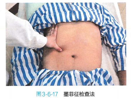胆囊疾病时,其肿大情况亦有不同,有时胆囊有炎症,但未肿大到肋缘以下,触诊不能查到胆囊,此时可探测胆囊触痛。检查时医生用左手掌平放于病人右胸下部,以拇指指腹勾压于右肋下胆囊点处(图3-6-17),然后嘱病人缓慢深吸气,在吸气过程中发炎的胆囊下移时碰到用力按压的拇指,即可引起疼痛,此为胆囊触痛,如因剧烈疼痛而致吸气中止称墨菲征(Murphy sign)阳性。