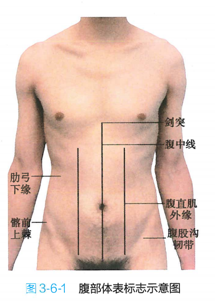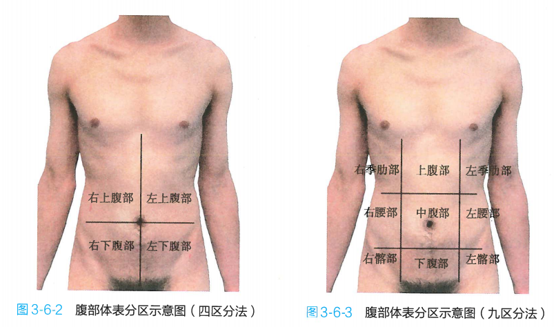 为了准确描写脏器病变和体征的部位及范围,常借助于腹部的天然体表标志,并可人为地将腹部划分为几个区,以便熟悉脏器的位置和其在体表的投影。