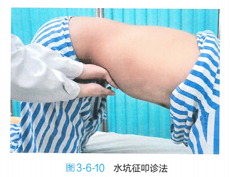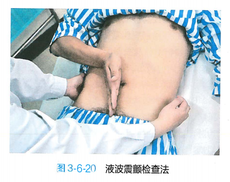 腹腔内有大量游离液体时,如用手指叩击腹部,可感到液波震颤(fluid thrill),或称波动感(fluctuation)。检查时病人平卧,医生以一手掌面贴于病人一侧腹壁,另一手四指并拢屈曲,用指端叩击对侧腹壁(或以指端冲击式触诊),如有大量液体存在,则贴于腹壁的手掌有被液体波动冲击的感觉,即波动感。为防止腹壁本身的震动传至对侧,可让另一人将手掌尺侧缘压于脐部腹中线上,即可阻止之(图3-6-20)。此法检查腹腔积液,需有3000~4000ml以上液量才能查出,不如移动性浊音敏感。此外,肥胖者可出现假阳性,应注意鉴别。