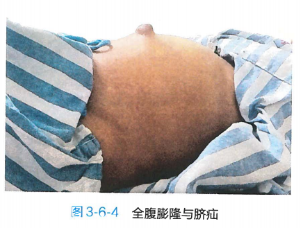 1. 全腹膨隆 腹部弥漫性膨隆,可呈球形或椭圆形,除因肥胖、腹壁皮下脂肪明显增多,脐凹陷外,因腹腔内容物增多所致者腹壁无增厚,受腹压影响使脐凸出。常见于下列情况。